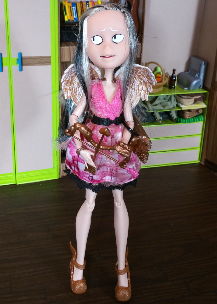 I’d almost forgotten this repaint to be honest, her head was too light for any body I had, including her original body, so I had experimetally stuck her on a tiny Breyer body, which was kind of cut but just not expressive or self-supporting in any way. And it still didn’t match. EAH has enough dolls in the super-white range that this one (Poppy?) is a great match for her though. I like her as an uncomfortable Cupid.