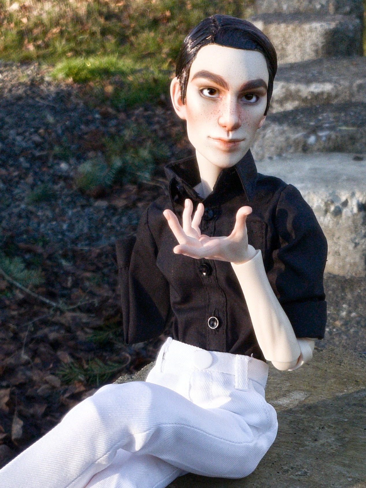 3D printed Tennant BJD, mk 1, from 2018! He was originally made for a Resinsound Tang body with Dollshe hands, then I got him an Akagidoll body later. He was sculpted by me in Sculptris and finished in Blender. I printed him on my Monosprice Maker Select Plus and finished the head with putty, spray can primer, lots of sanding, and a terrible thick coat of Krylon spray paint. His hard cap wig is saran and very much glued in place, haha.