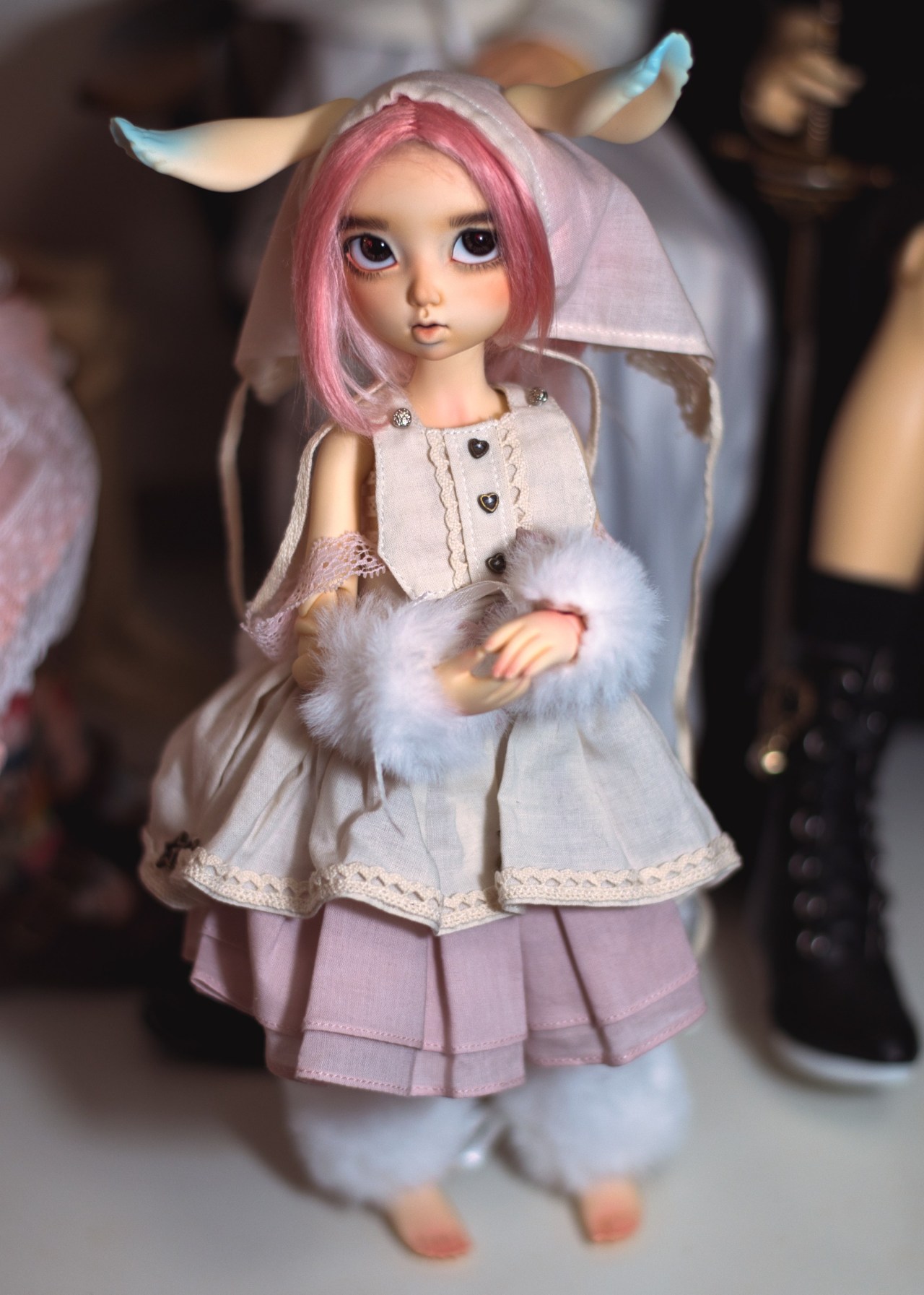 I finally got a chance to seal the faceup layer on LTF Soony so that she could be put back together! In between I decided that I wanted her to be a little taller so I picked up this Dollzone Mini Jing body and fullset, which is SUPER cute and the yellow resin is actually a great match. I just had to flip one of the magnets in the ears to work with the LTF headback’s magnets. I did somehow mess up her upper liner in the process of sealing the faceup layer? Just the upper liner, very odd. I’ll have to paint over it.