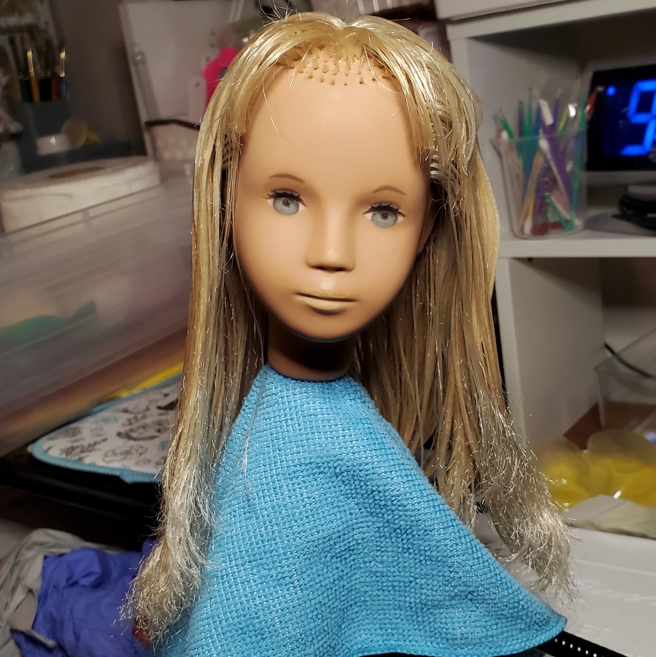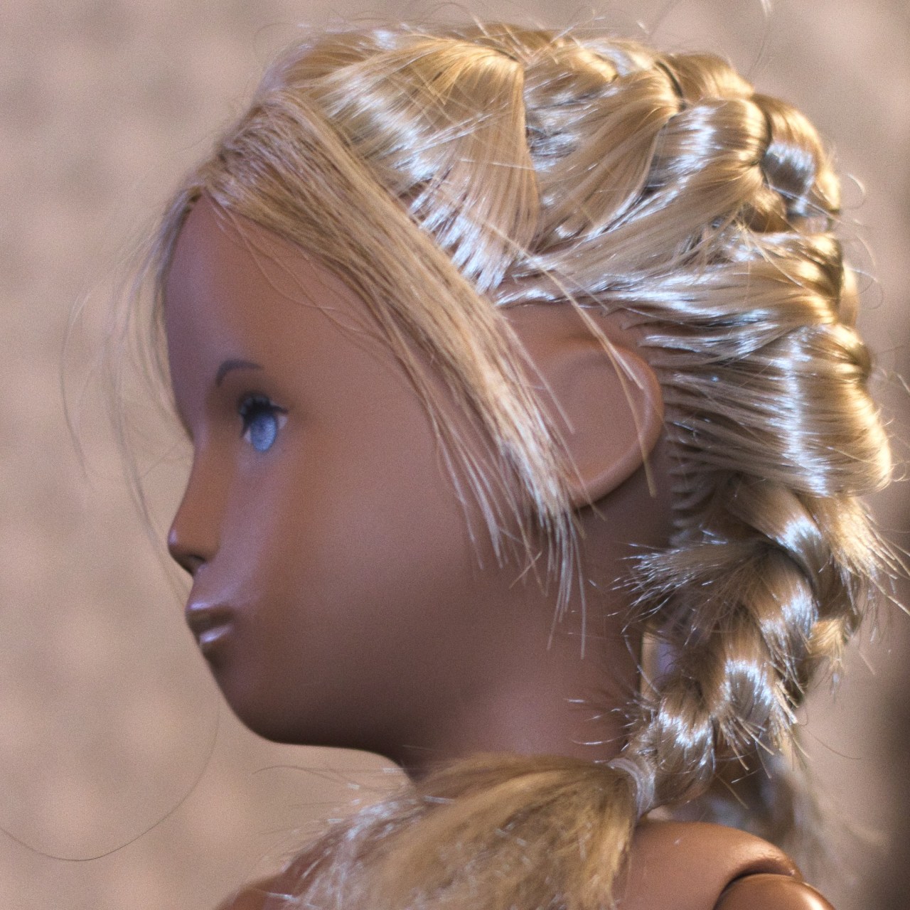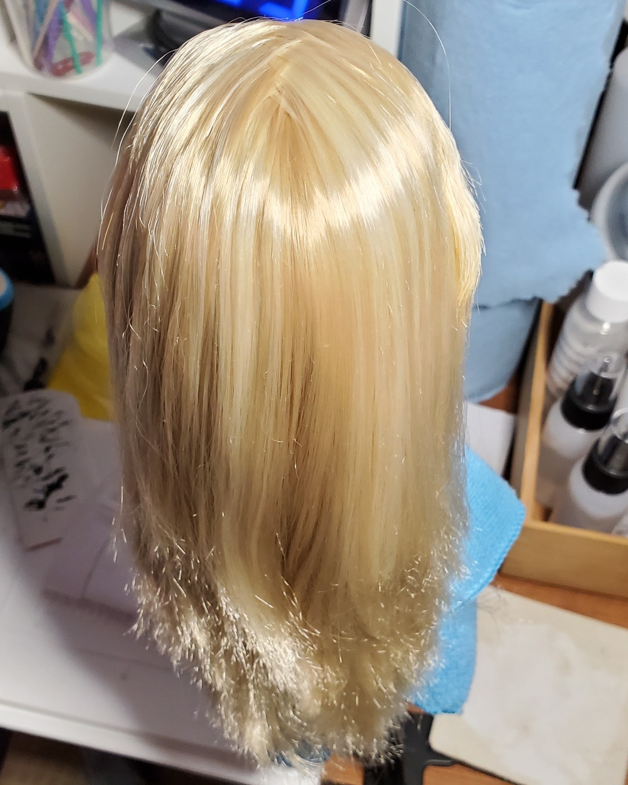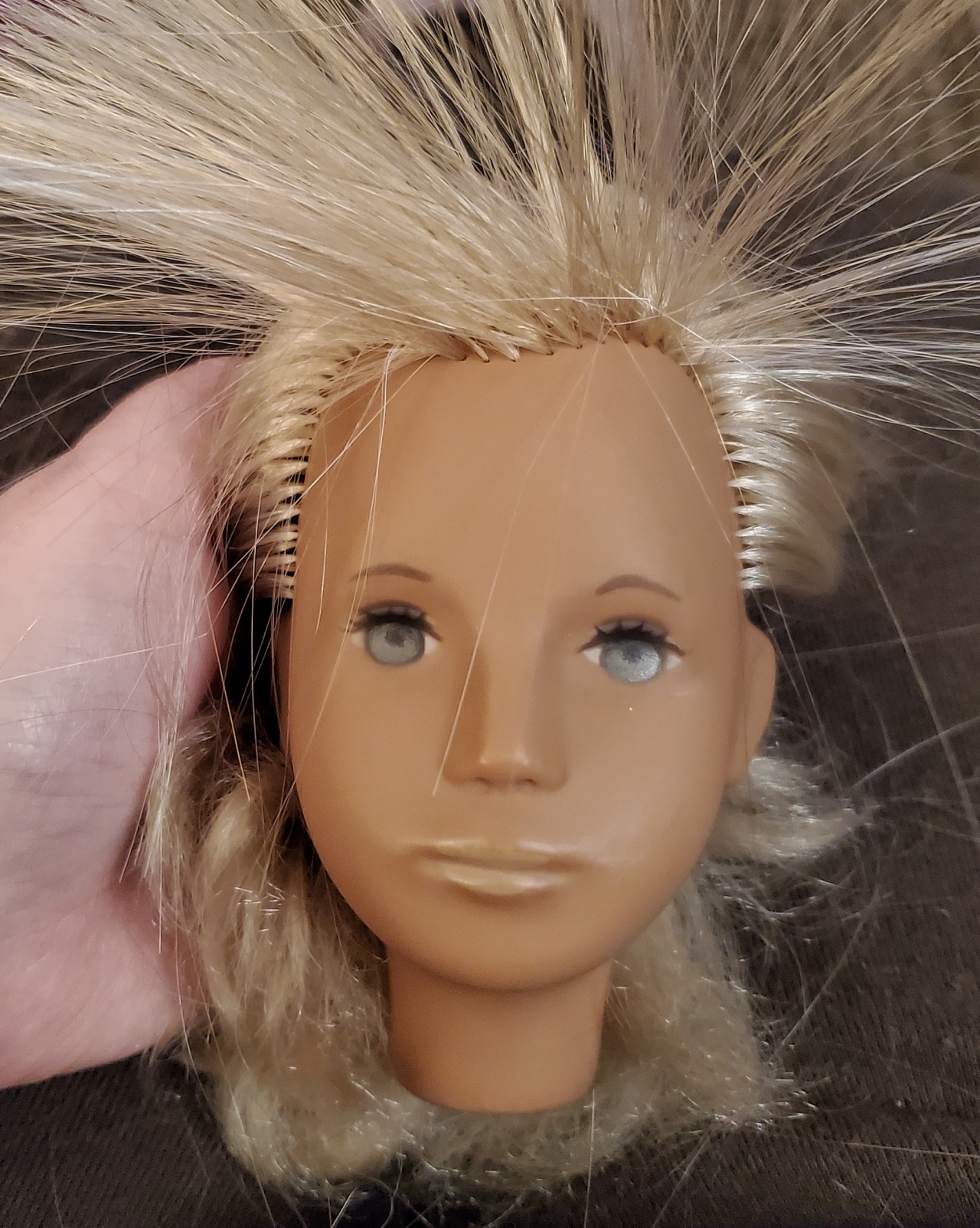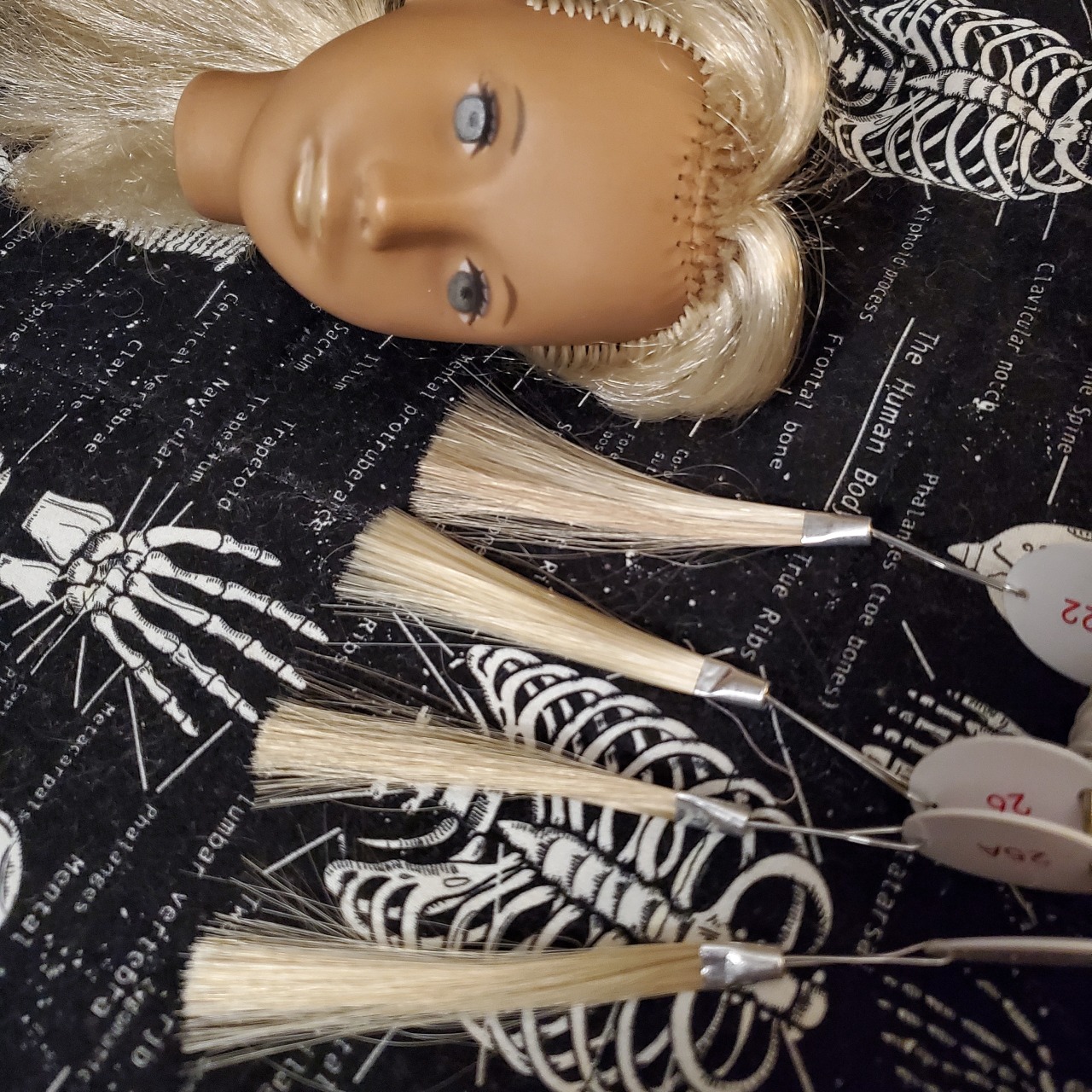Sasha doll updates! She got a good thorough wash and I conditioned her hair, then I went about pulling out her cut bang plugs (quite difficult) and replacing them. I made an order from Monique Trading Co on their last day, and while I had ordered one of their hair sample rings, they sent me four of them, so I had plenty of hair and colors to try. I picked some of the hairs that matched best – they were the regular hair type, not synthetic mohair, i.e. I think Modacrylic and not Kanekalon. I rooted them in using the tension method, and this hair was pretty terrible for that because it’s stiff and had a bend set into it pretty hard already where it was folded over the metal piece on the ring.