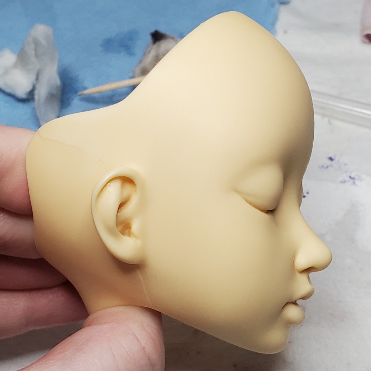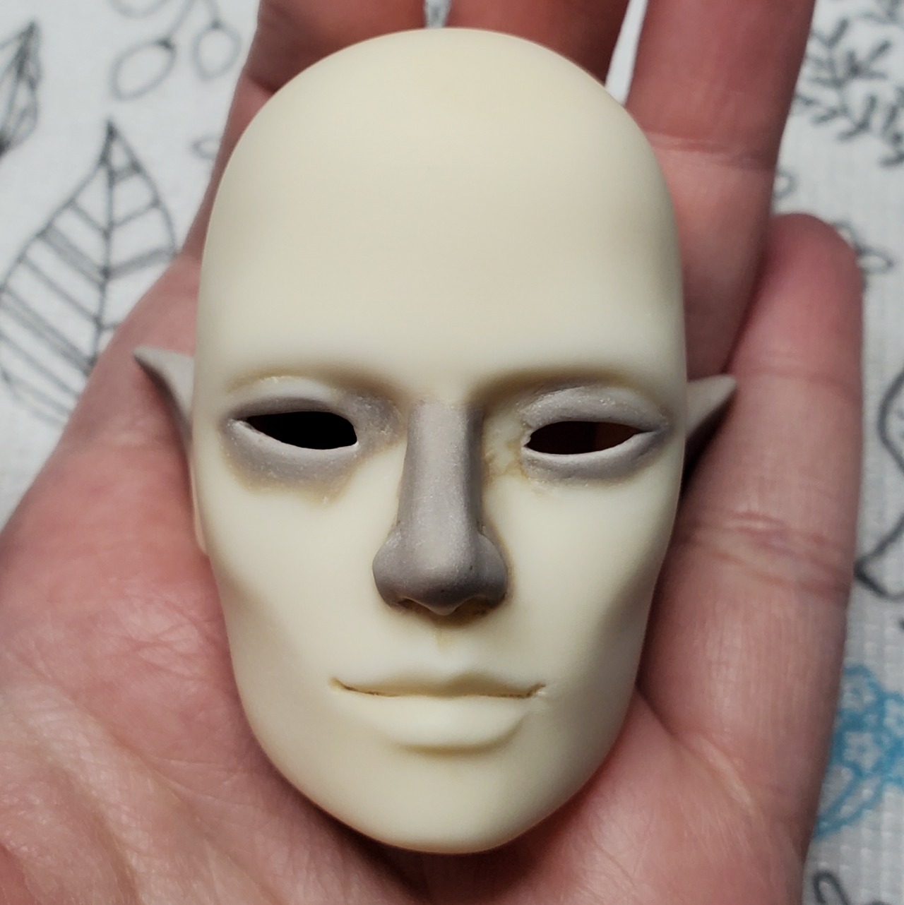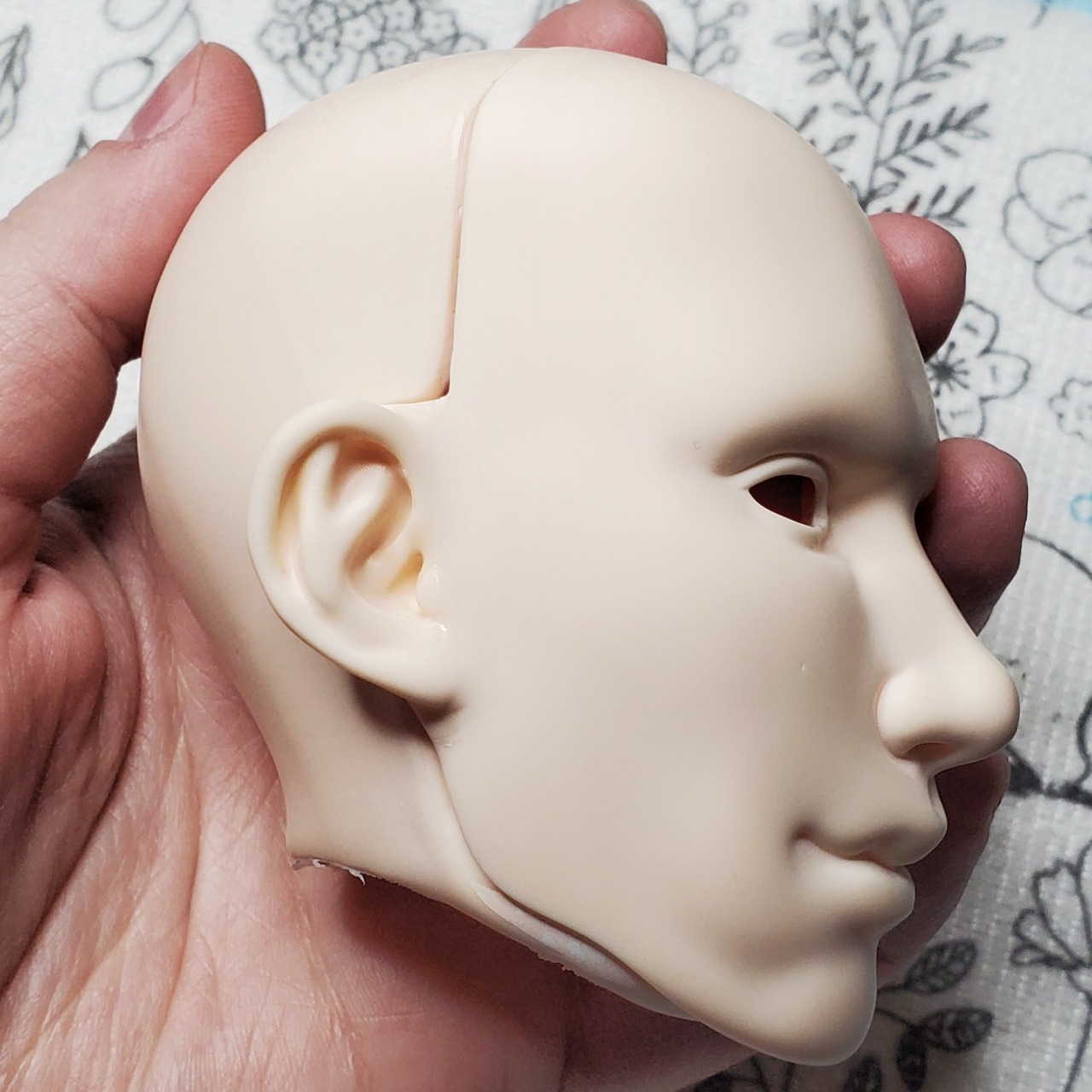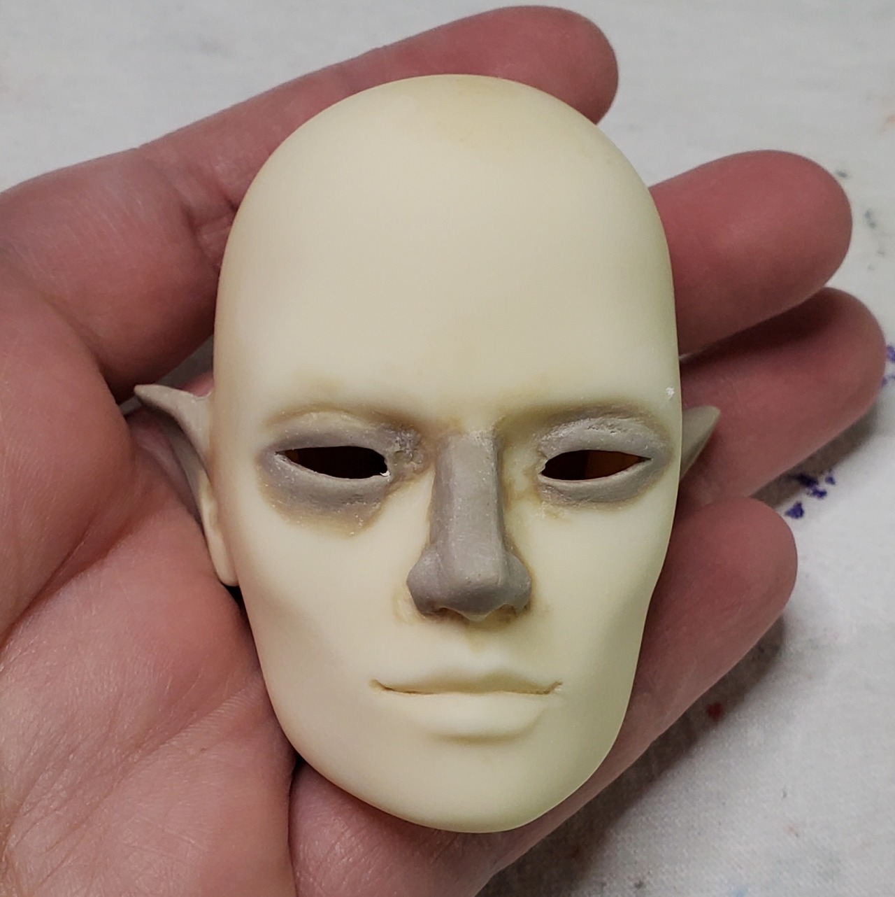 This is a modded Batchix St. George head that bought from Krowbar/handy_dandy_degenerate_candy at PNW BJD Expo way back in 2017. At the time I asked if they would mind me redoing the faceup and they said they didn’t mind at all, but it wasn’t something I felt up to tackling for a long time. He finally has a body I think feels right for him (the WS Dream Valley 51cm body) and I finally felt up to starting on it. The mods were pretty rough under the paint so I sanded him some more, but not enough apparently! I’m trying to use some Vallejo acrylic primer instead of just paint, so there’s more sanding and spraying ahead for me but I think it’ll look nicer than regular acrylic in the end.