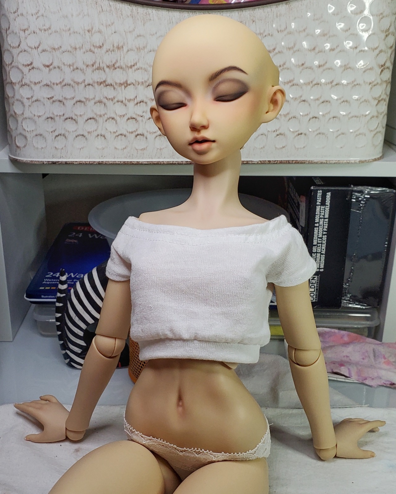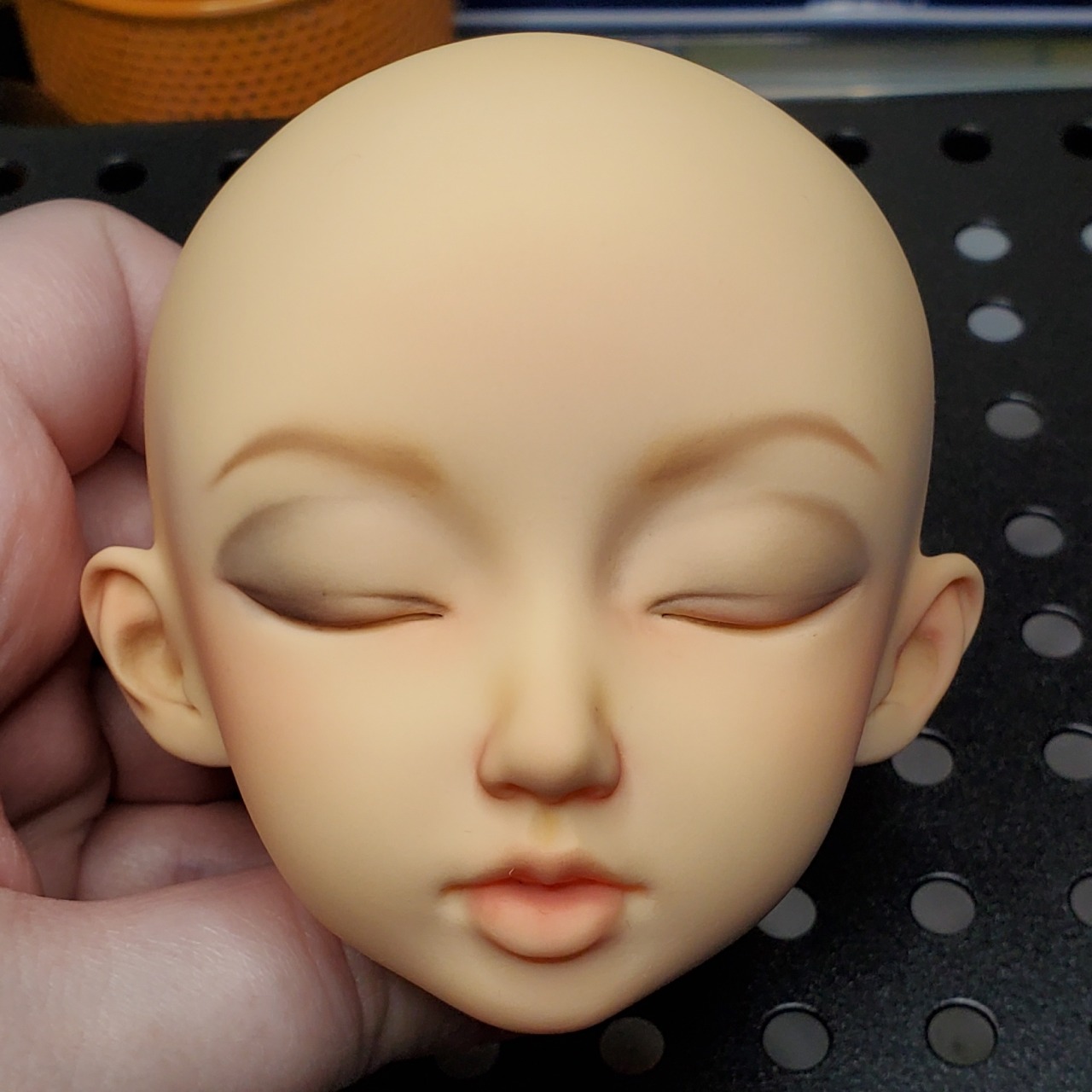 Not having a great time lately, either at the personal, work or global level. Just doing what I can. Working on something I like in the off time is always good, though. Here’s faceup progress on my sleeping Soony. She’s very softly color matched to the DD1 body… I wanted her to be in-between enough that I could use either the DD1 or the Delf/F60 hybrid body if I wanted.