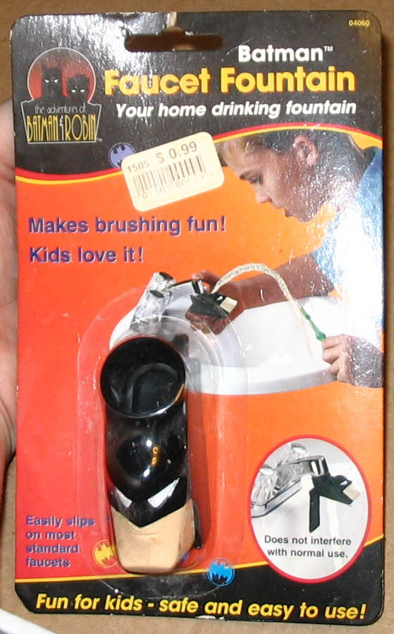 The absurd wonders of Bat-merch. A faucet accessory in the shape of the Bruce Timm Batman’s head, branded The Adventures of Batman and Robin. Of COURSE children will enjoy brushing their teeth more if water streams out of Batman’s forehead!