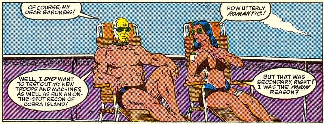Destro … WHY? You … swim trunks with your metal mask and nothing else? How do you think that tan is going to turn out?