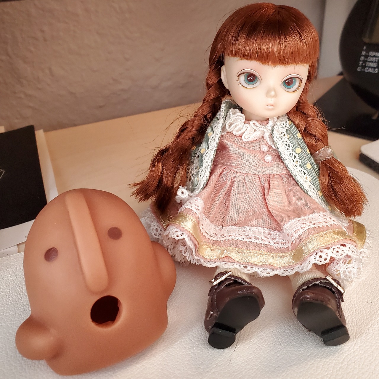 Another girl I’ve been working on since summer because I’ve very slow! I got this Torrie head from Dollmore. Torrie was actually the first BJD I ever had, about 14 years before I got this one. I had originally picked her as an alternative to Soony, the one I really loved, because she was smaller and less expensive. I eventually sold her because I was afraid to do much with her, and disappointed that she wasn’t Soony. Now that the Soony-shaped hole in my heart is full I can appreciate her on her own merits, and she is an adorable sculpt that I have no fear of doing my own customization on. I put her on the modded Resinsoul body that Juri used to be on, and the match is a lot better.