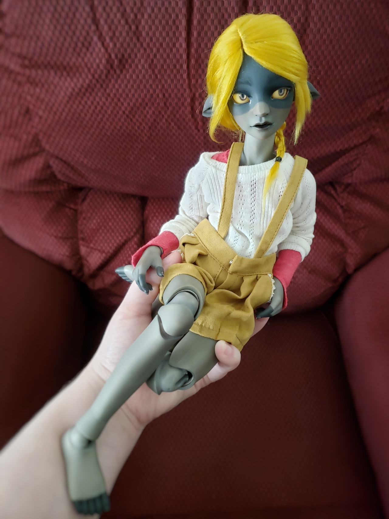 They were dyed with Rit Dyemore (after an ordeal where my iDye Poly wouldn’t stay the same color for 5 minutes), sueded, scarred and painted. They’ve had two custom wigs, one with Tibetan lamb and one with brushed yarn, and several pairs of custom resin eyes.