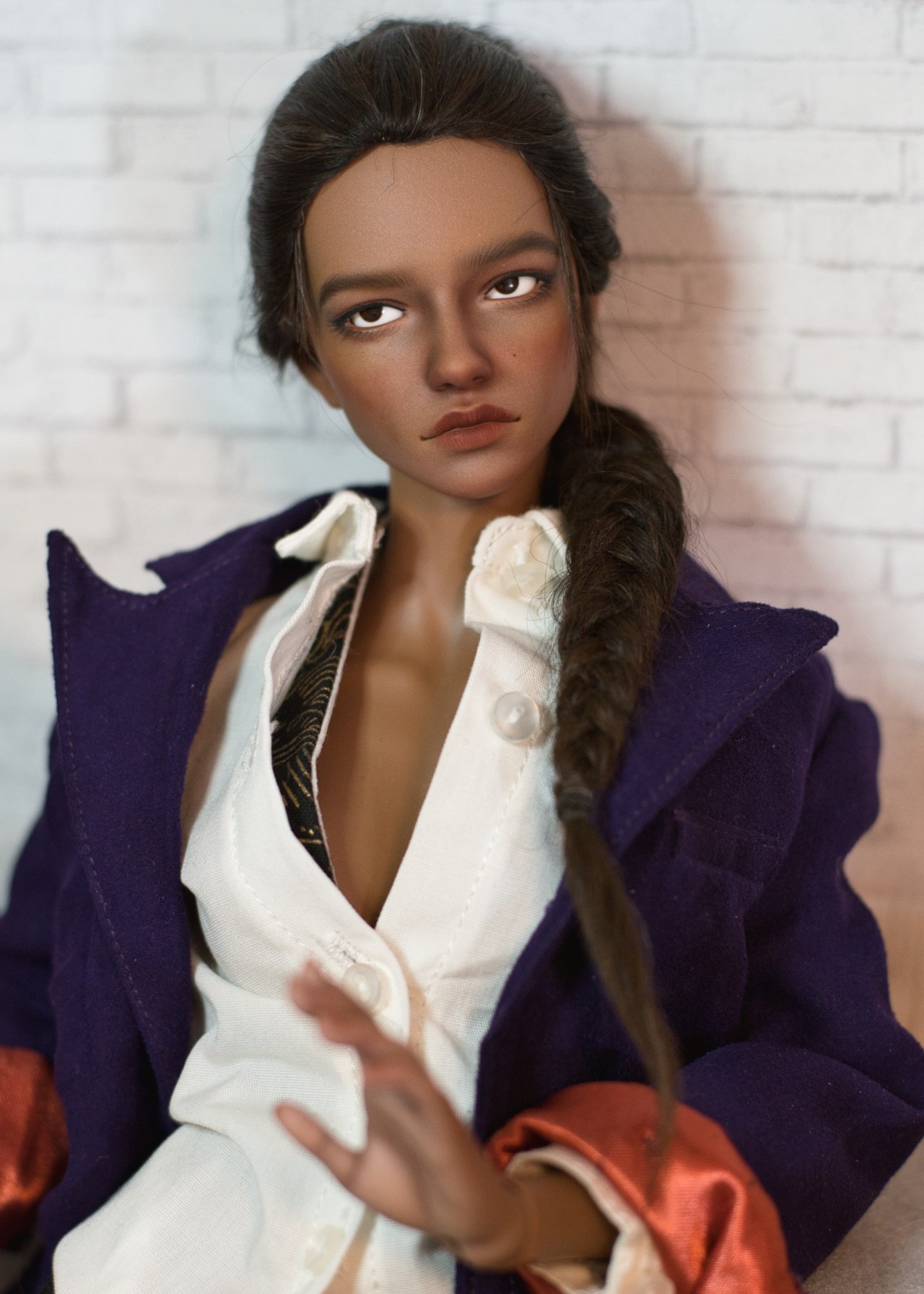 Once I was actually nearly finished with my OC dolls, but not off my OC dolls kick, naturally I started thinking about shelling more OCs. King had been in the back of my head for a while, but I never come across any Project Doll Parts that seemed like they would work for her. When I realized the scale that Daniel and Tennant had turned out, though, I realized… hmm, that’s about FID size. And Iplehouse is a great aesthetic match for a Barbie like King. And when I went looking, I found a perfect combination of sculpt and color for her on the DoA marketplace, so that was that.