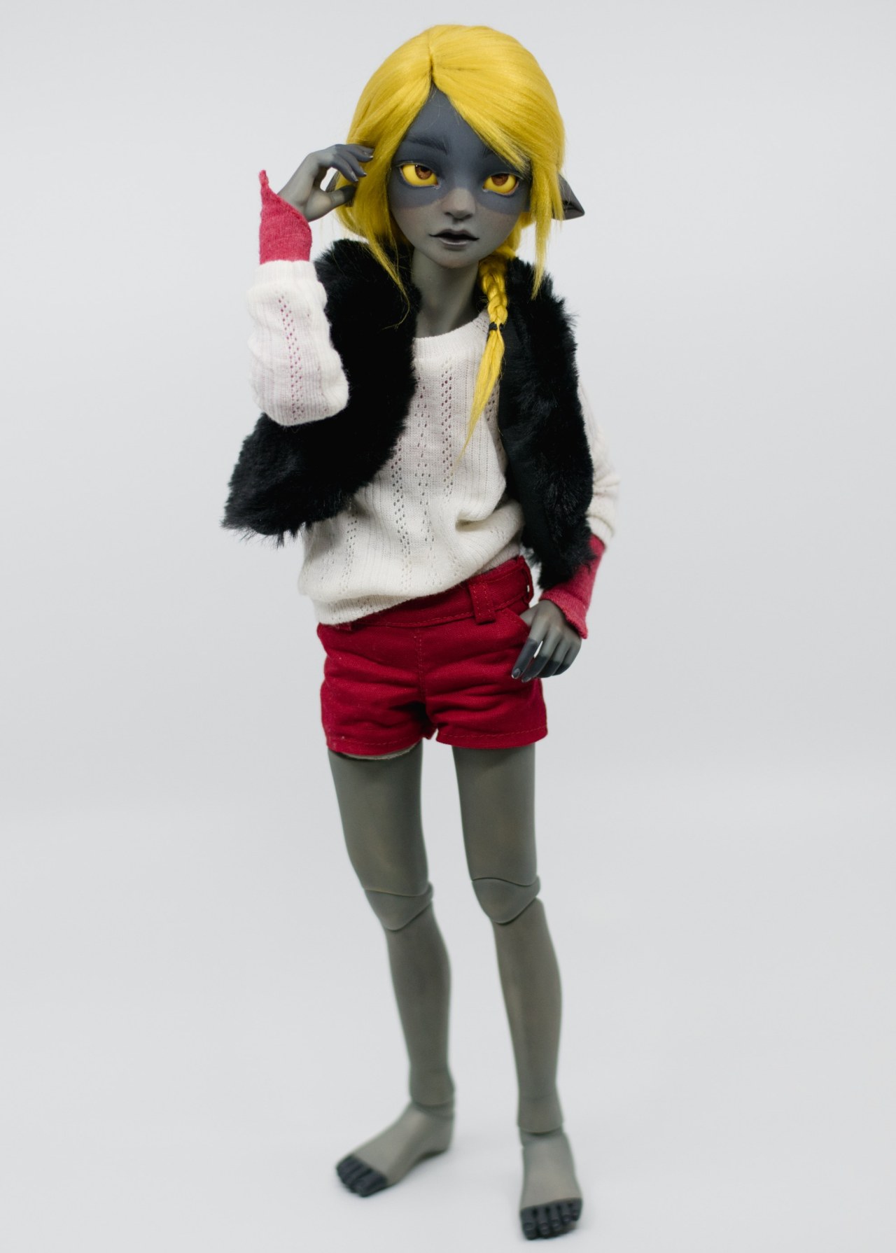 I also did a mouth opening with custom tooth piece, downturned elf ears, and filled in the sides of the eyes, then did some general face sanding mods.