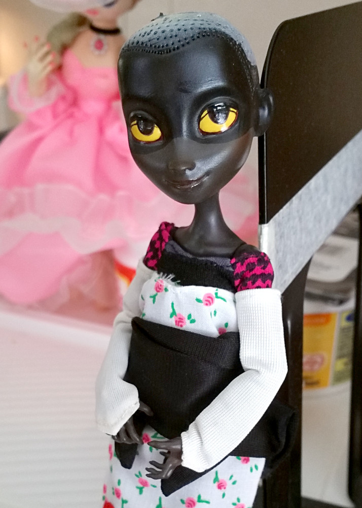 The wig was also a fun experiment, and it hides the fact that she has no ears. It’s a very lazy plastic-and-painted-masking-tape hard cap with glued-on tibetan lamb that I got from the trim of a $1 skirt from a rummage sale at the local children’s theater, which is probably the weirdest possible source of specialty craft supplies. I have no idea why that skirt was trimmed with that.