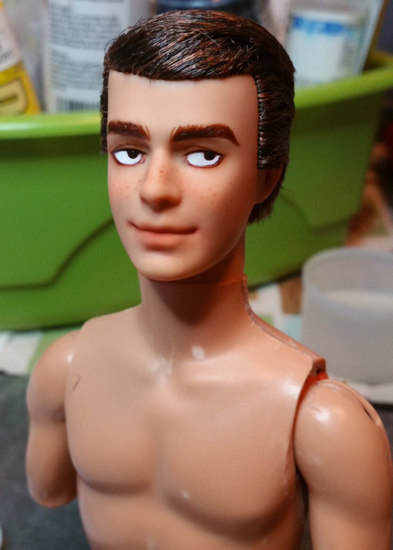 Remember when I painted doll-Tennant originally and my concept was just that I wanted him to be a nicer guy than my other characters? HAHAHA. Anyway, I’d fallen very much out of love with his repaint, so, time to do him over. It ended up being way too late to finish his face in one sitting so here’s a WIP with eyes + rough brows + slapdash pastels so he doesn’t look nakedfaced (these fade like hell without sealing so I wasn’t fussy).