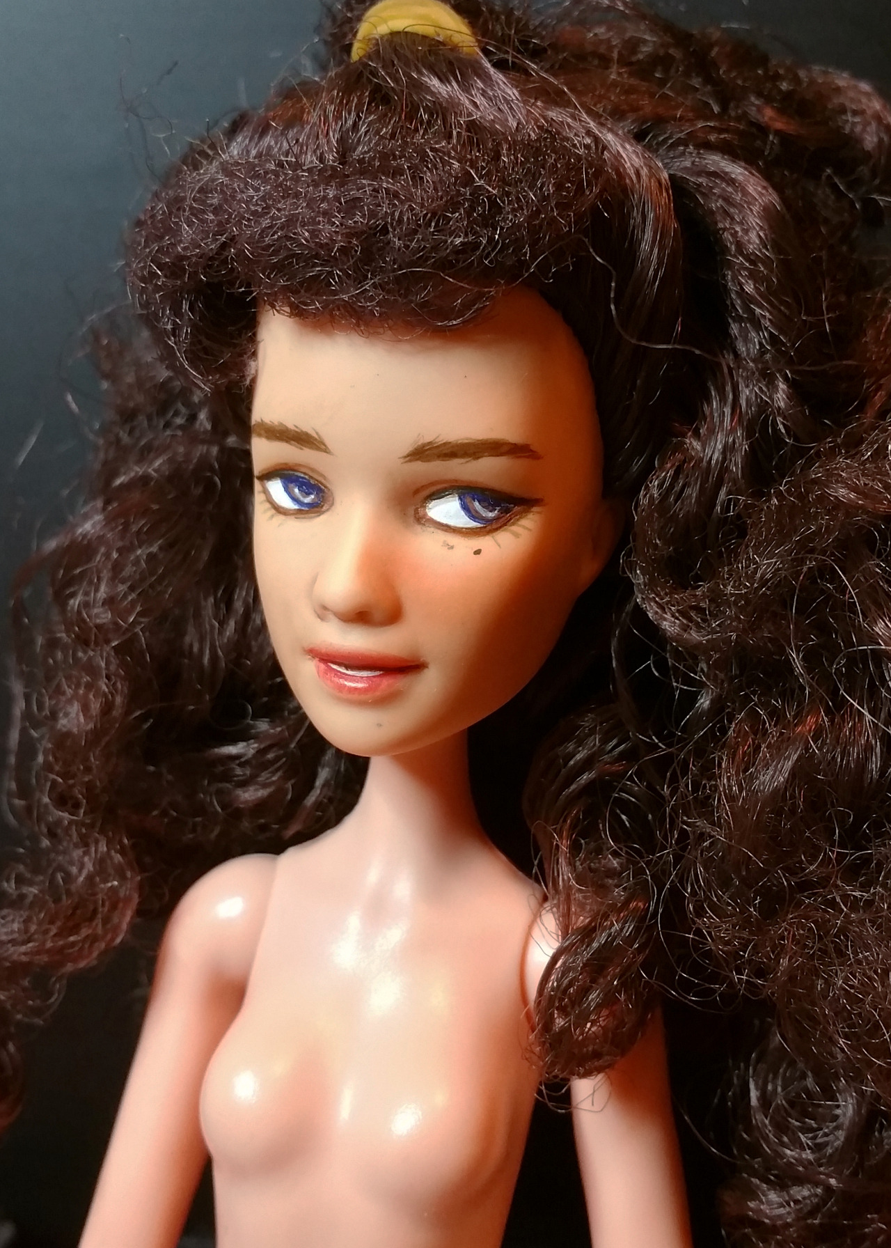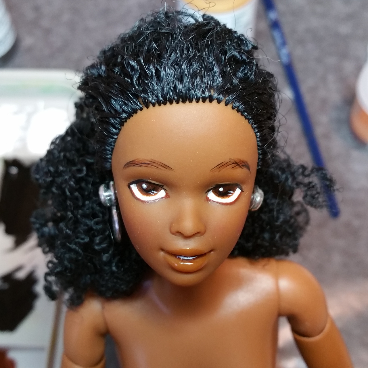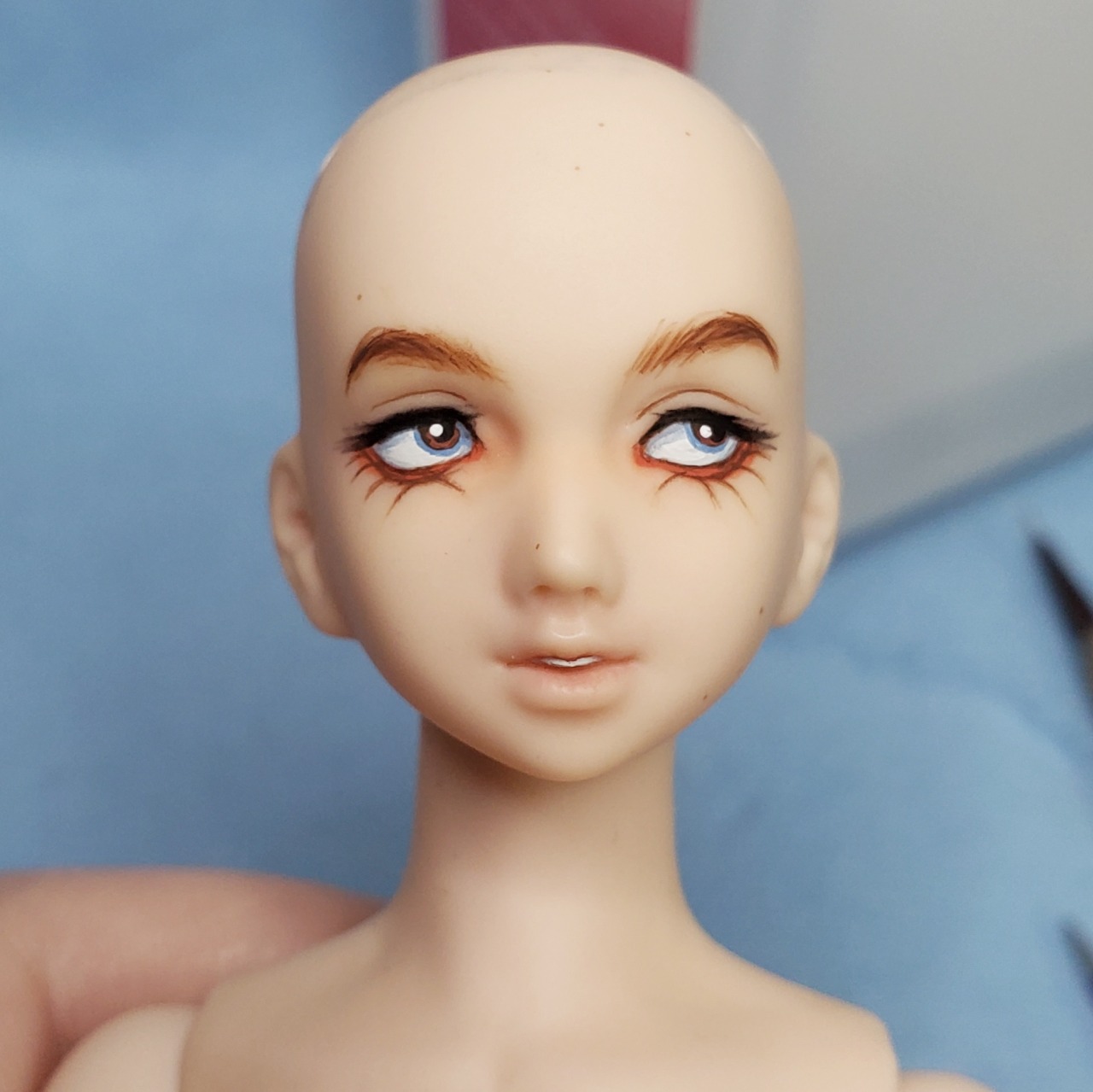 Anyway, I did the very obvious eye surgery thing using an exacto knife and diamond files. The head glue was, as others have noted, super weird but at least less gross. I positioned the eyes up considerably higher than the painted eyes so she looks pretty different. The eyes are 16 or 18 mm – I don’t know and I honestly don’t remember where I got them? It is a mystery. I did her faceup BJD style, it was fun.
