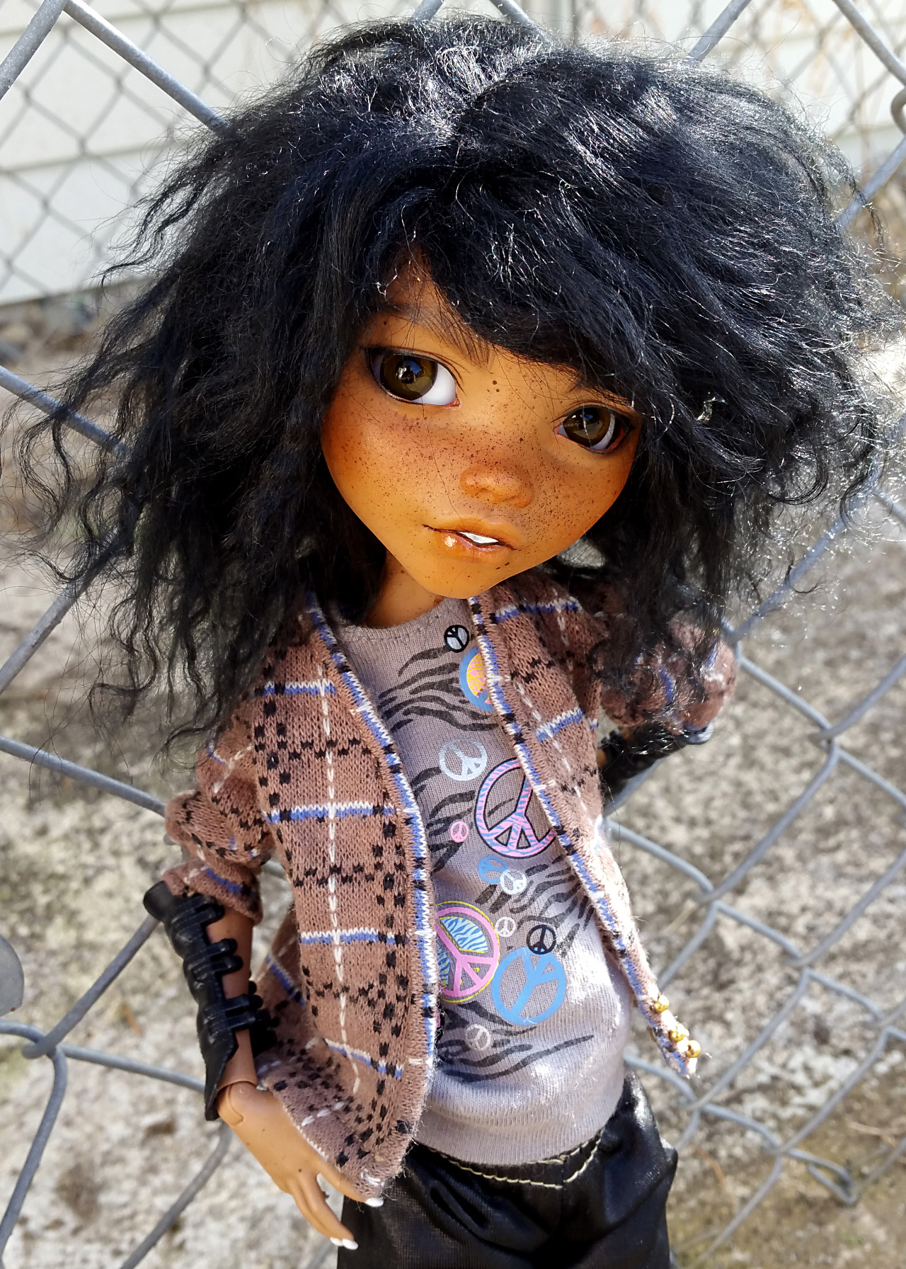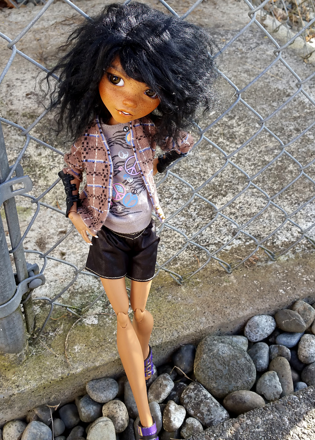 Anyway, seeing as that post was my most popular ever (!) I figured I should get a couple pictures of her dressed for y’all. She has a BFC Ink shirt, Ken shorts, a mystery sweater, Avea’s leg guard things, and her original boots which I cut down.