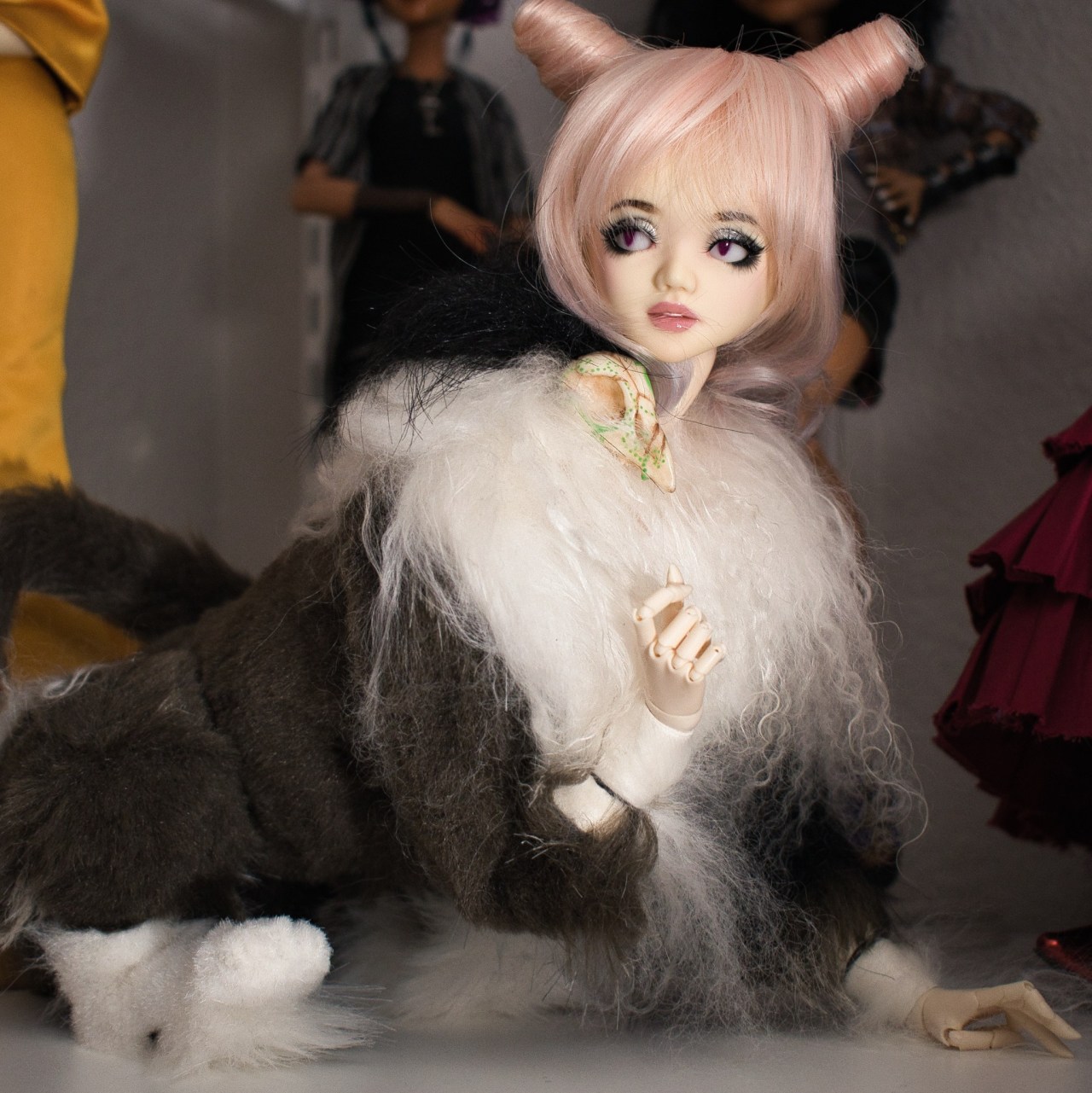 I got an Unoa Lusis head at a doll show and decided that I wanted her to be a Sphinx! Imade her body in the posable art doll style and I learned a ton about how to do it better in the future, haha. She has a Buff headback, the sanded Resinsoul Tang upper torso I had left over from Daniel, and a pair of ResinSoul jointed hands. I 3D printed the wrist parts. She borrowed Soony’s wig for the convention I brought her to (November 2019, RIP conventions), then I got her a better one than the gray wig in the top photo there but I haven’t gotten a photo of her in it yet.